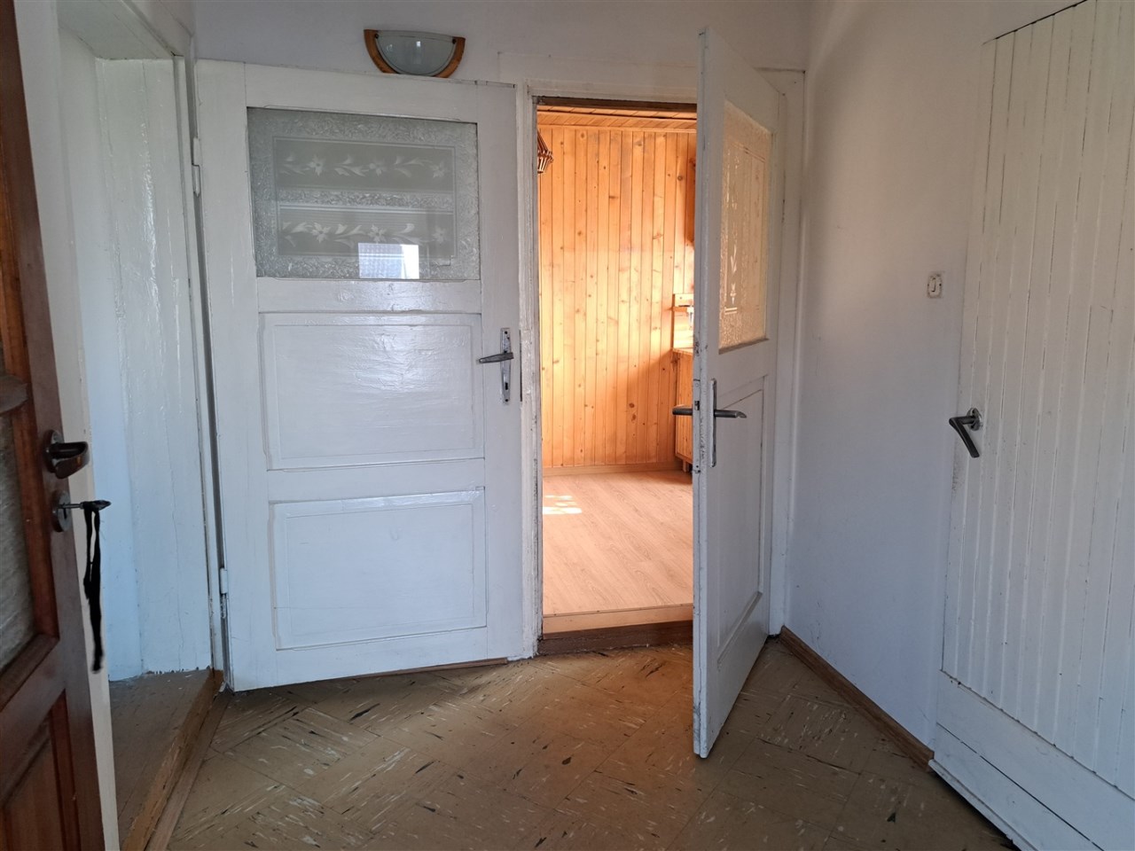 parter: wiatrołap, przedpokój, Wc, pokój, kuchnia przechodnia, pokój